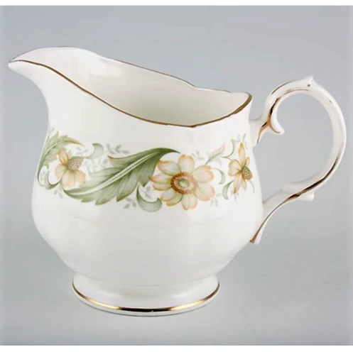 Duchess Greensleeves has a classic floral design of green, brown and shades peach with a gold band on pure white fine English bone china.
