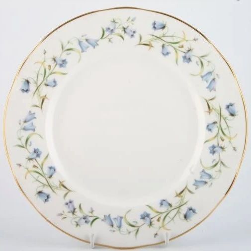 Harebell is one of the most popular patterns. It displays blue harebells with green stalks on white Bone China with a gold trim.