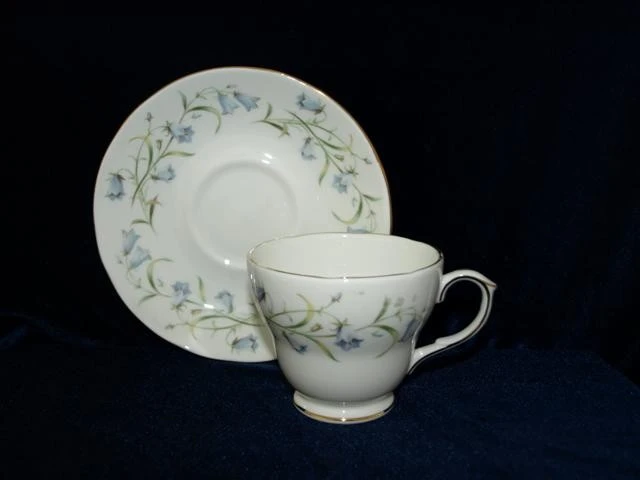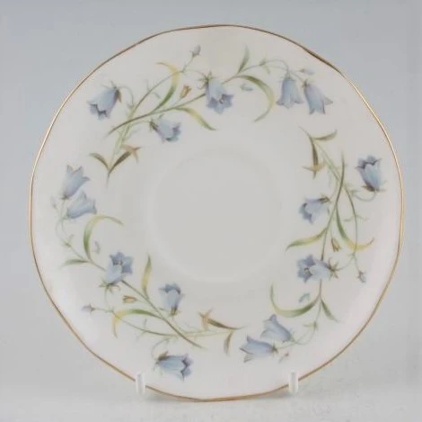 Harebell is one of the most popular patterns. It displays blue harebells with green stalks on white Bone China with a gold trim.
