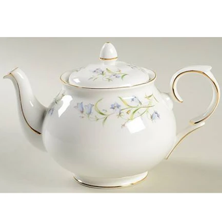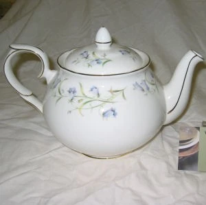 Harebell is one of the most popular patterns. It displays blue harebells with green stalks on white Bone China with a gold trim.