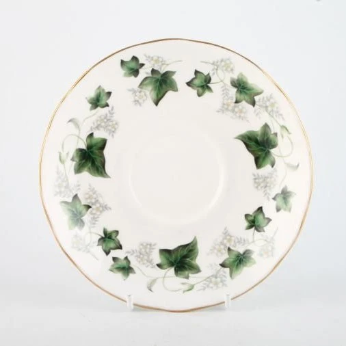 A lovely Ivy pattern interspersed with subtle white flowers on pure white fine bone china with a gold rim.