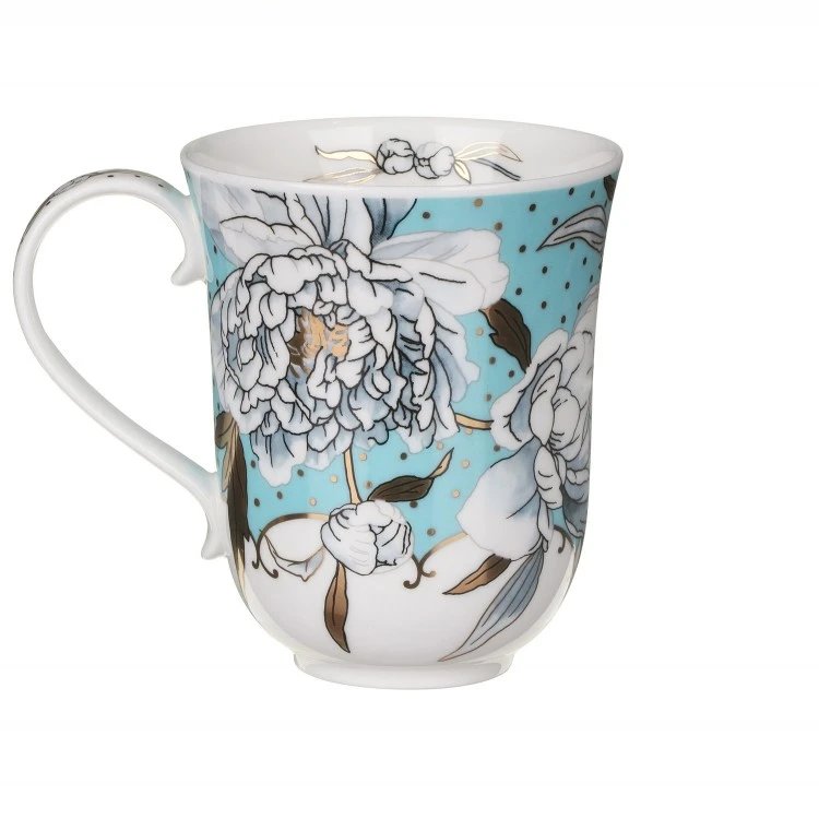 The fabulous blooms are shaded in a watercolour style with gold embellishments which are complimented by the sky-blue backdrop with gold dots. Peony buds and leaves on the inside rim match the design on the front of the mug.