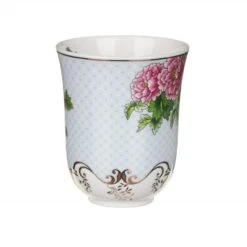 This ornate mug features full blooms of cerise pink, peony-like flowers on a pastel blue and white backdrop. The elegant white border around the bottom feature’s delicate gold leaf waves and leaves which is also used on the rim and handle. Inside the rim of this decorative floral mug is a repeat of the beautiful cerise peony.