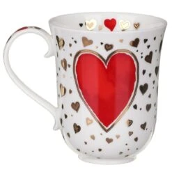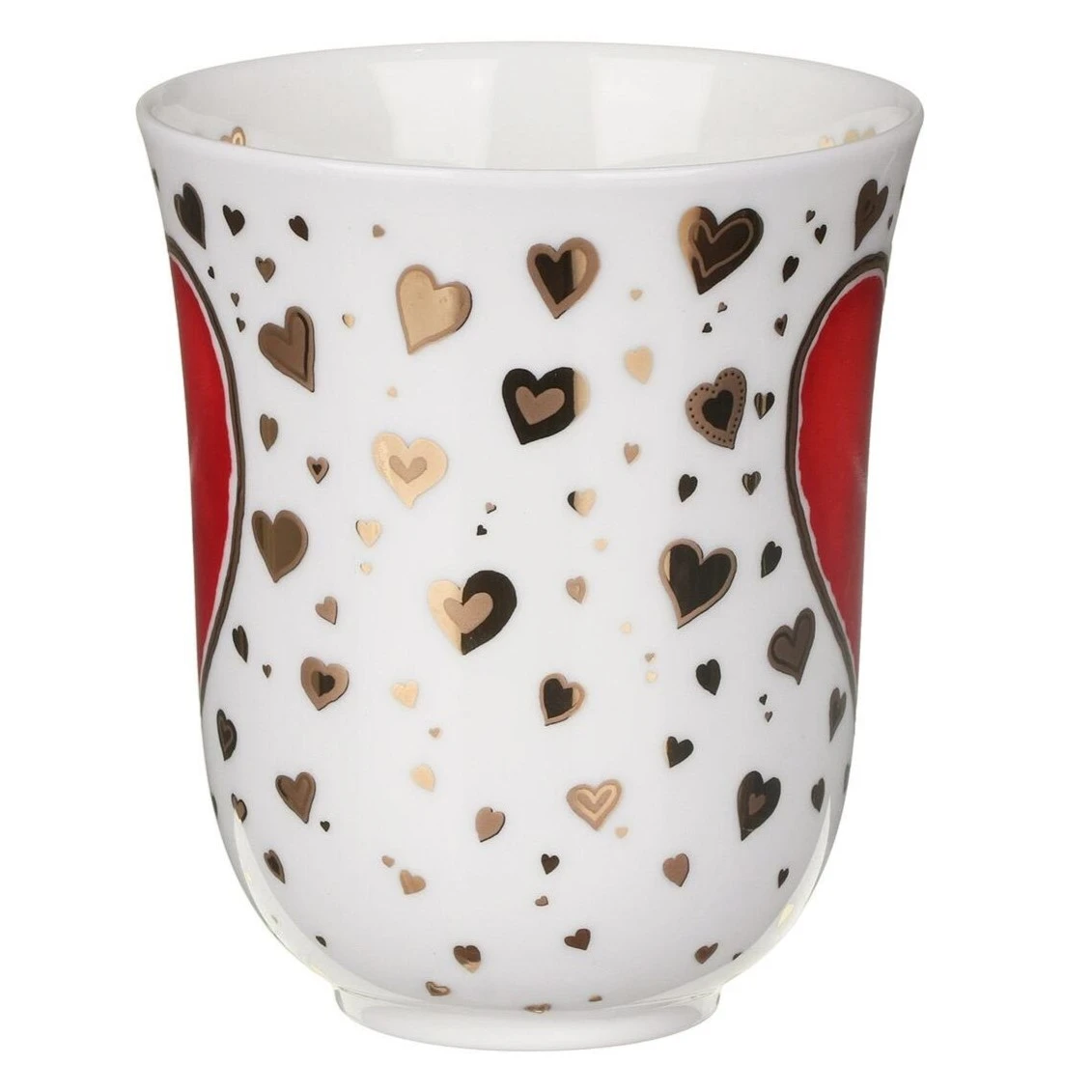 A variety of 22 carat, two tone gold hearts are scattered around bold, red watercolour hearts. Ideal for someone you love.