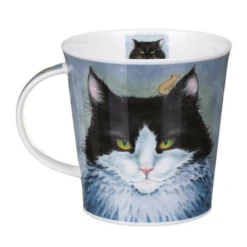 Beautiful and bright tabby, black and ginger cats, both short and long-haired on either side of the mug. Green eyes glinting in spring sunshine, they are sat on a washed blue background, with a little brown mouse on the cats head, along with on the handle. One of these mugs would make a lovely gift for anyone who loves cats, enjoys gardens or just appreciates talented painting!
