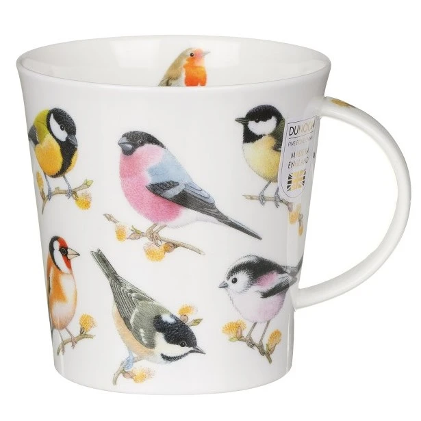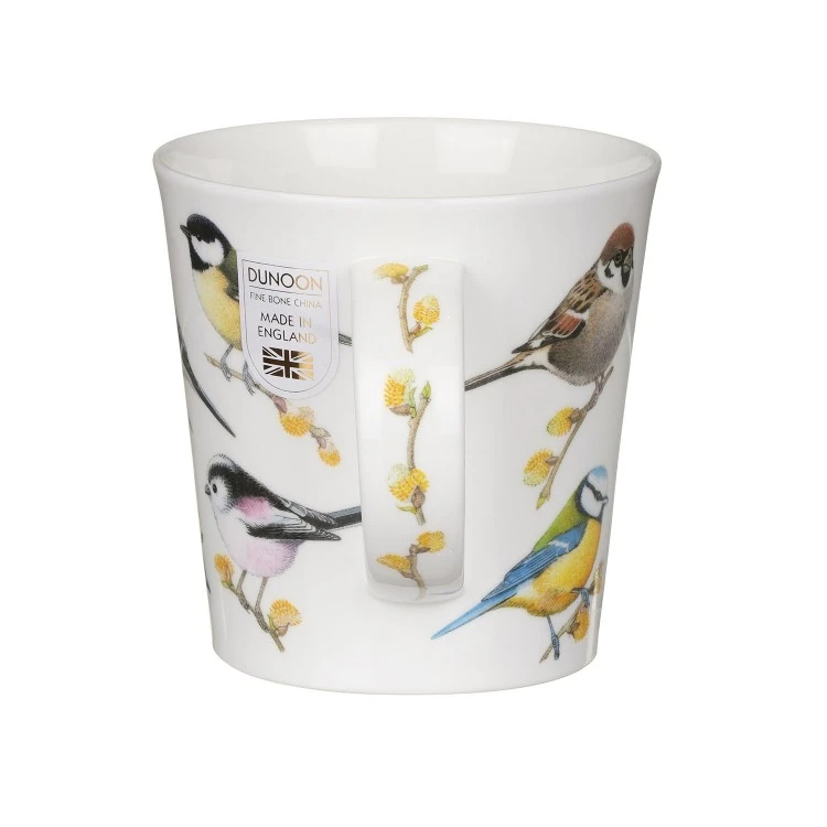 Enjoy your morning tea or coffee in this beautiful mug covered in song birds. Nine different garden birds with incredible detail are featured on the mug, ranging from Bluetit to Firecrest, each one sits upon a small branch with berries. The handle features twigs with leaves and berries, inside the rim of the mug is a single goldfinch.Â