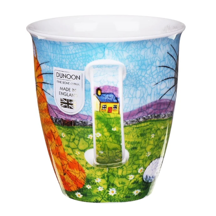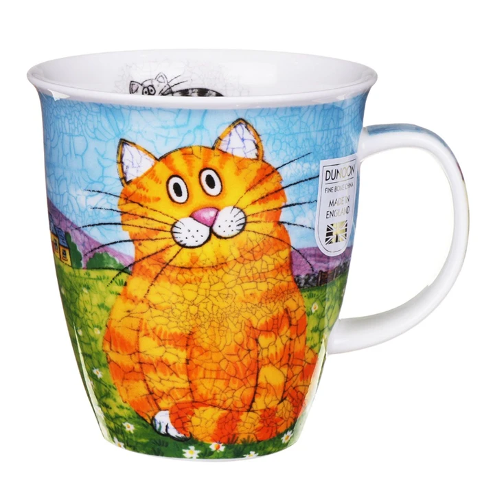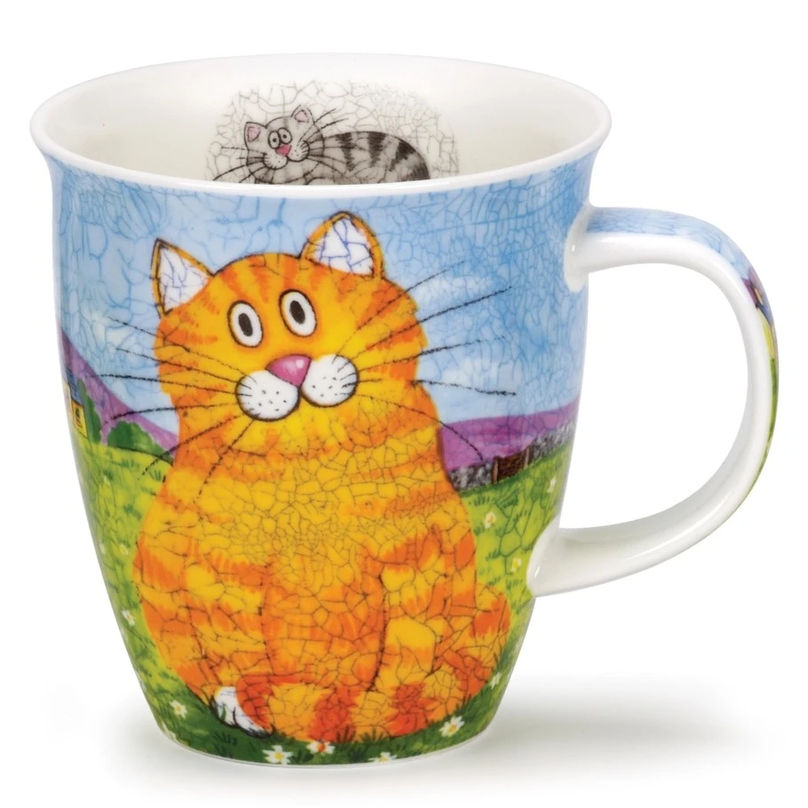 Smiling cats sitting on rolling pastures on long, summer days. This design by Jane Brookshw uses a fashionable, mottled and crackly effect. This mug has a ginger cat on the front and a silver tabby cat on the back.