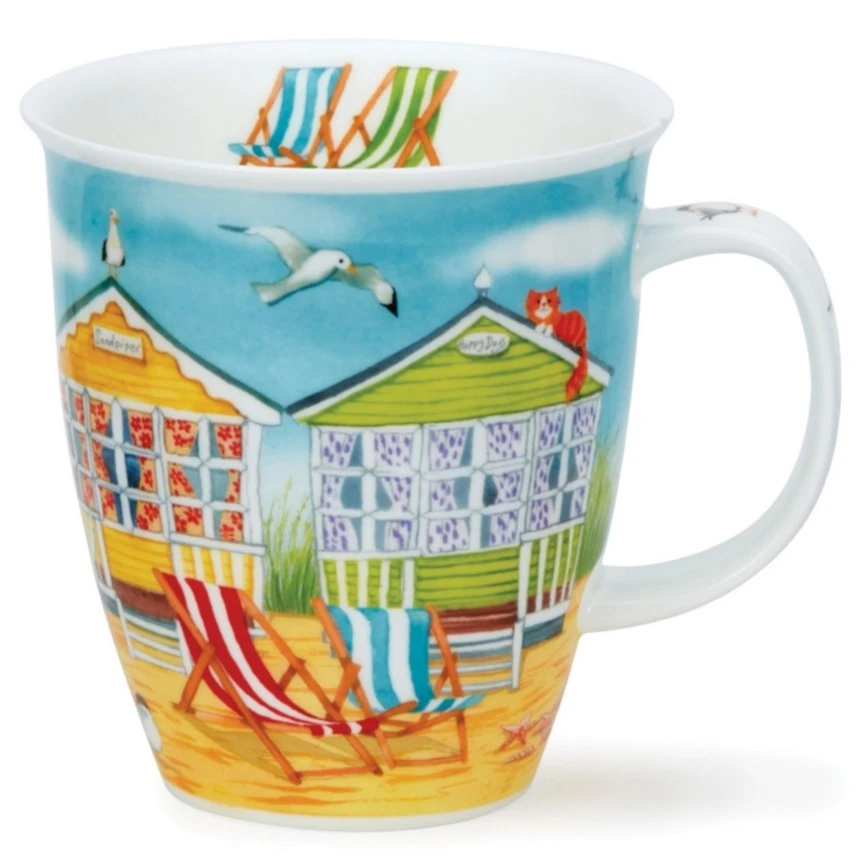 Brightly coloured beach huts line up along the golden sands, where gulls fly ahead. Deckchairs and picnic baskets await the lucky holiday-goers.