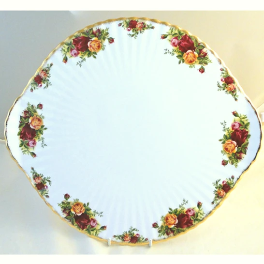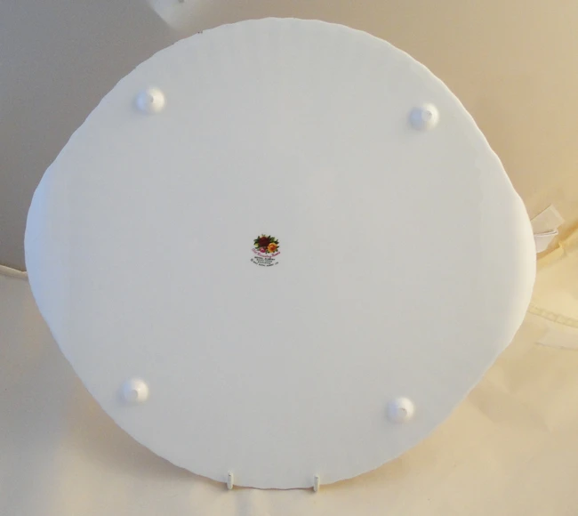 A very unusual large circular serving platter from Royal Albert in the Old Country Roses pattern. This platter has an impressive diameter of approximately 13.75″ making it a spectacular centre piece to any table setting. As can be seen from the photographs it stands on small feet that are integrated into the design.