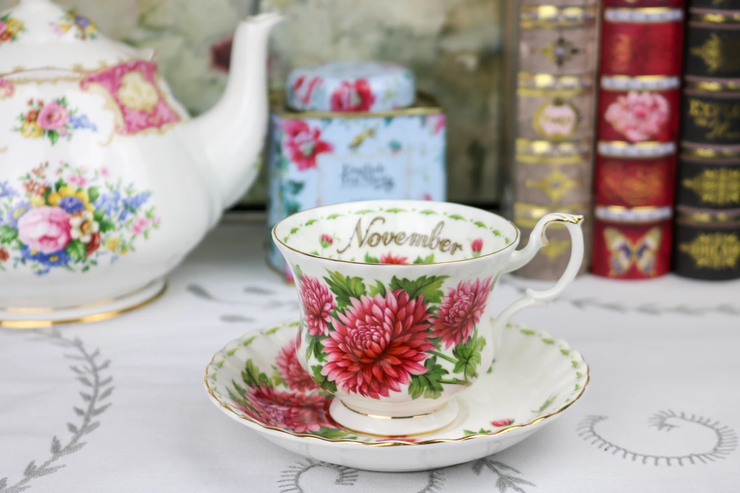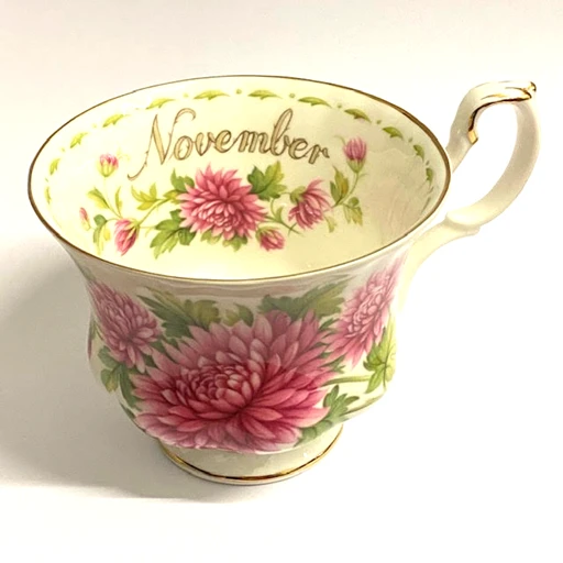 Royal Albert Flower of the Month series – 1970. Series of 12 includes:Â Snowdrops, Violets, Anemones, Sweet Pea, Lily of the Valley, Roses, Forget-Me-Not, Poppy, Michaelmas Daisy, Cosmos, Chrysanthemum, Christmas Rose