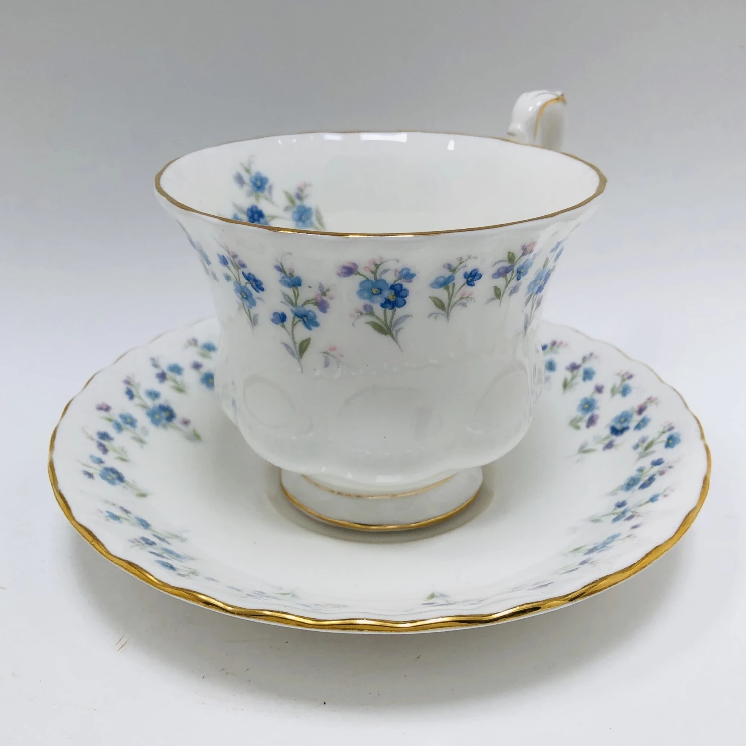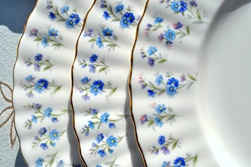 “Memory Lane” pattern was first made in 1965 and was produced until 1973. The pattern is composed of small sprigs of light and medium blue flowers (forget-me-nots) with light green stems and leaves. The tips of the flowers have a hint of pink. Beautifully trimmed in gold.