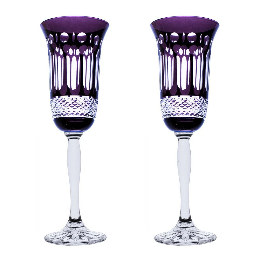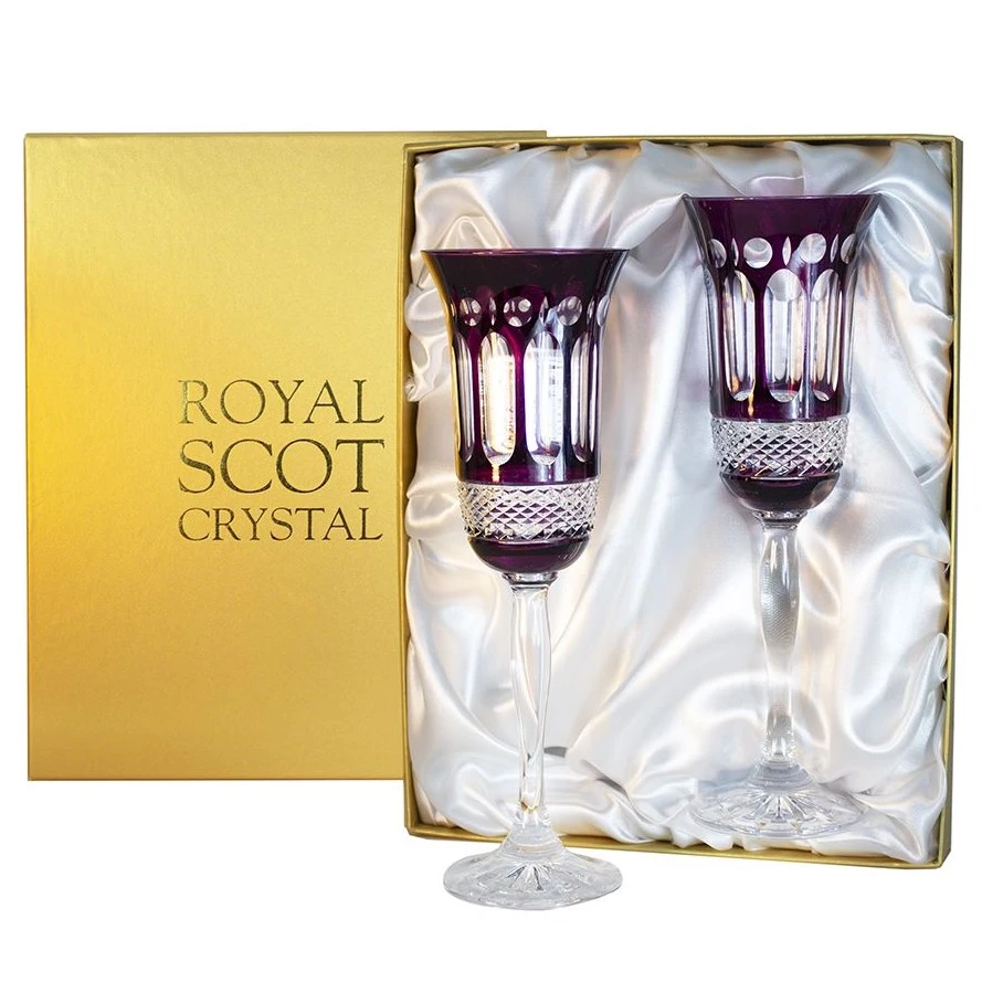 The beautiful pair of Mulberry coloured champagne flutes are supplied in luxurious gold satin lined boxes.