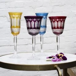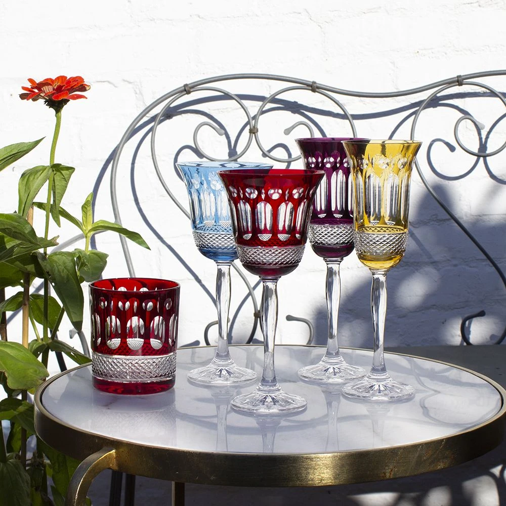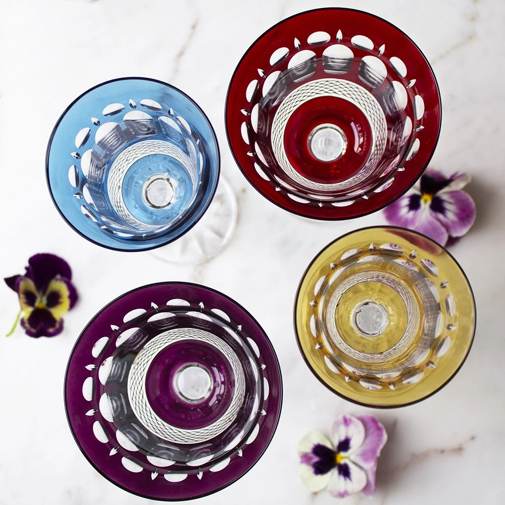 A stunning collection of Jewel coloured hand cut lead crystal synonymous with the regality and opulence of London’s highly fashionable Belgravia district. Each glass is lavishly hand cut creating a beautiful kaleidescope effect.