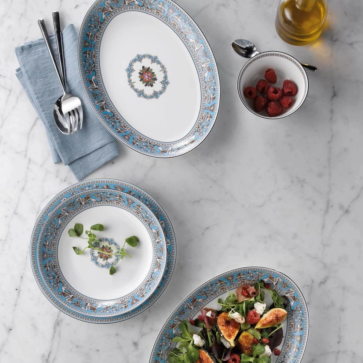 There are few patterns that live up to the richness of Florentine Turquoise; first introduced in 1931 on a fine bone china body and characterized by an ornate border intricately detailed with a cacophony of mystical creatures and fantastical flora. The collection features a wealth of delicately hand-rendered motifs set against the clarity of white, fine bone china. A truly glorious collection with a heritage stretching back seven decades.