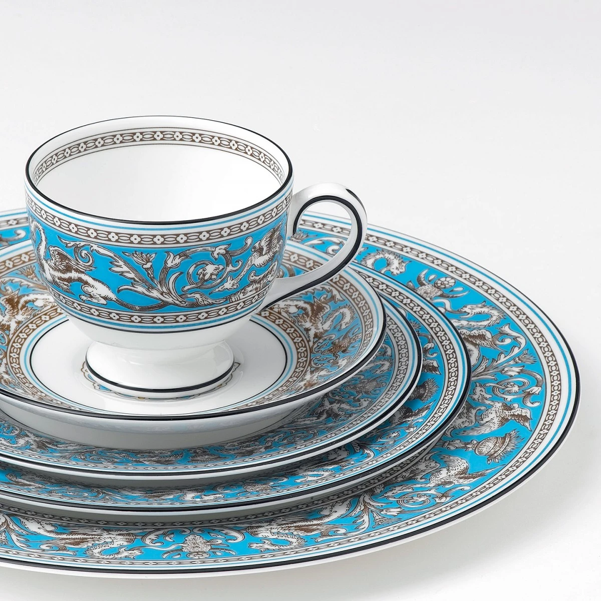 There are few patterns that live up to the richness of Florentine Turquoise; first introduced in 1931 on a fine bone china body and characterized by an ornate border intricately detailed with a cacophony of mystical creatures and fantastical flora. The collection features a wealth of delicately hand-rendered motifs set against the clarity of white, fine bone china. A truly glorious collection with a heritage stretching back seven decades.