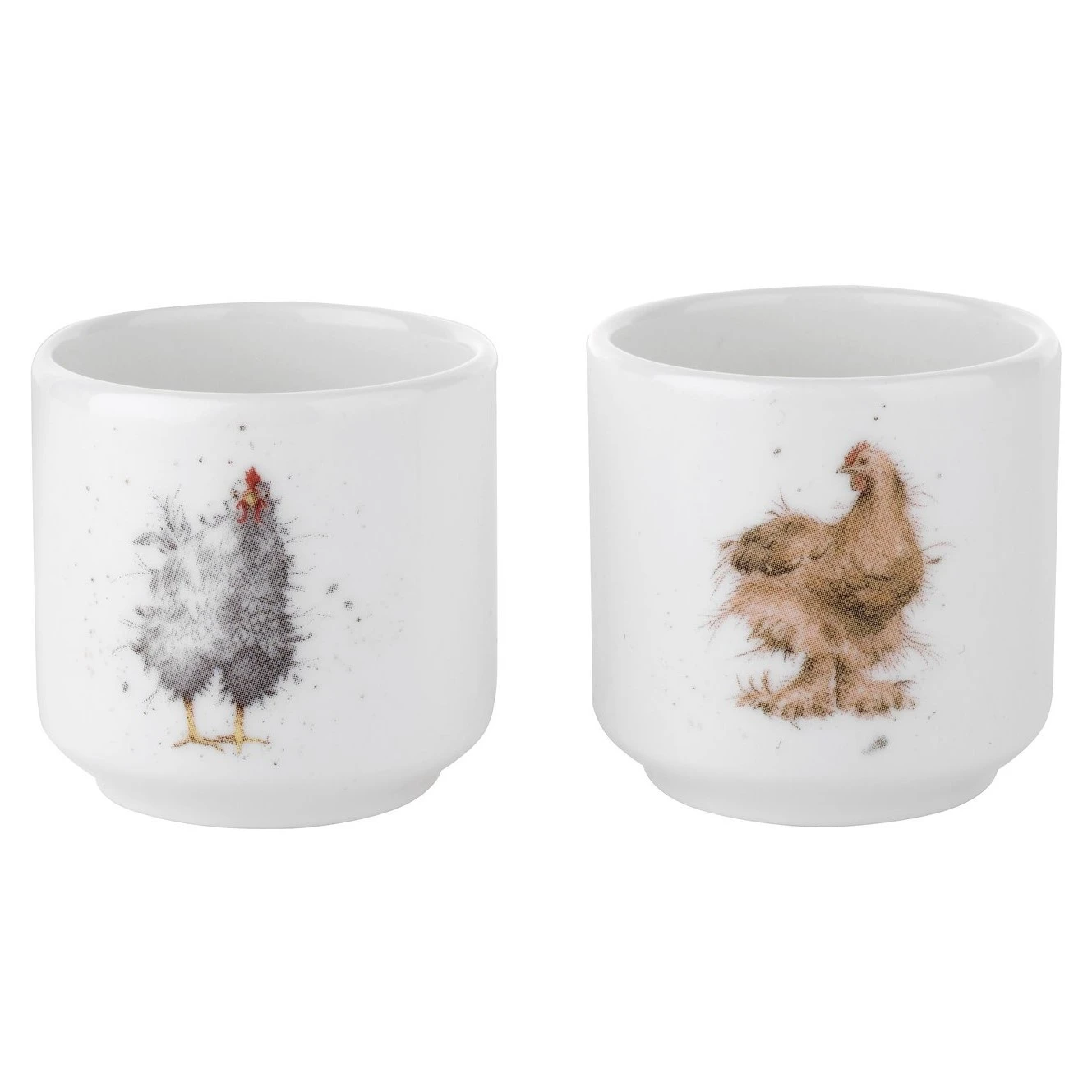 A pair of porcelain egg cups featuring ‘Curious Hen’ and ‘Henrietta Cluck’ From Wrendale Designs.