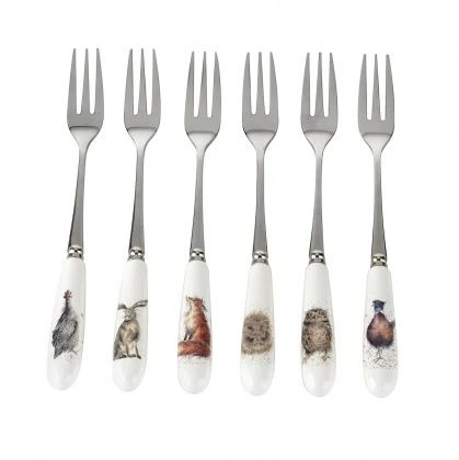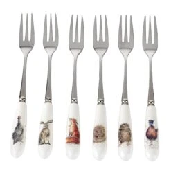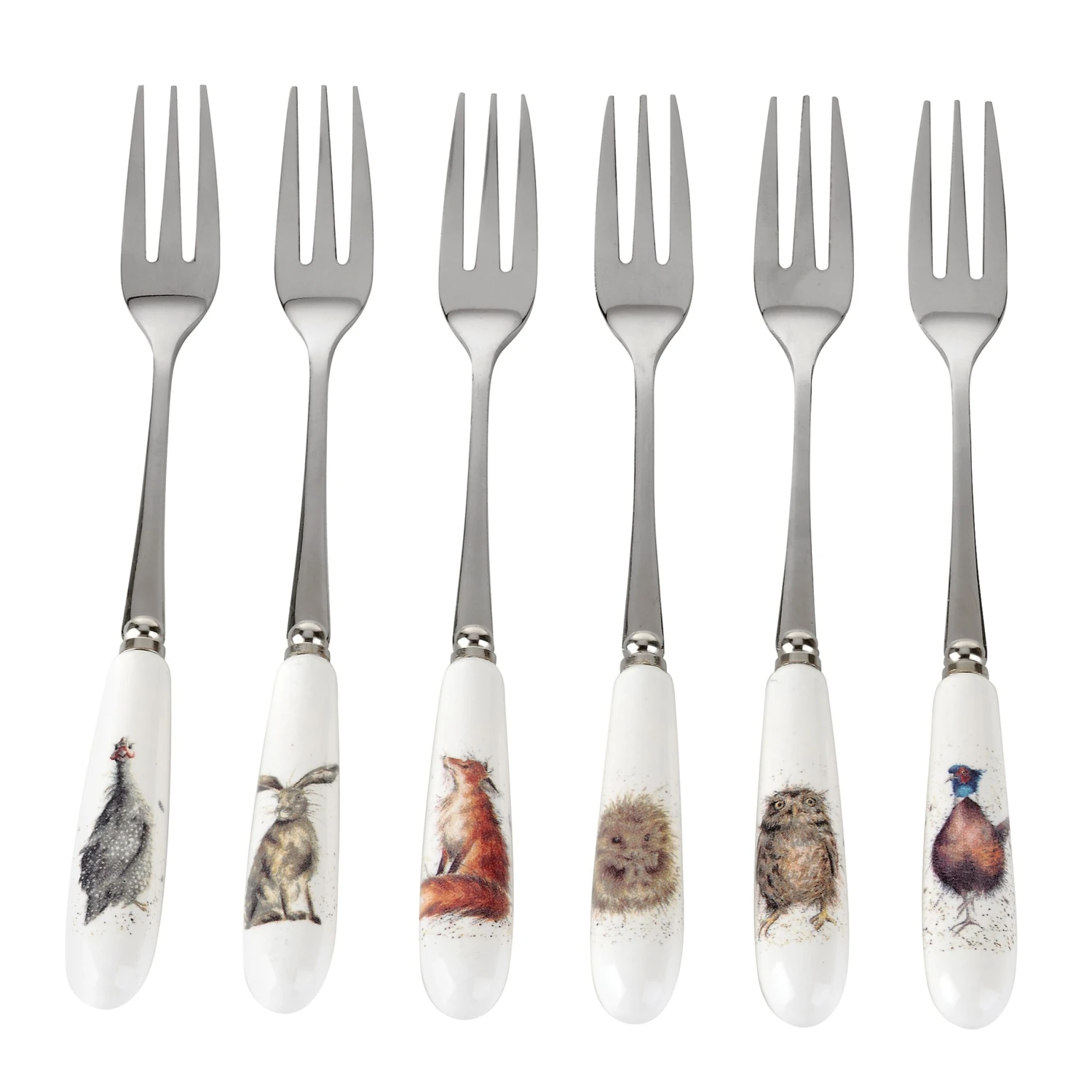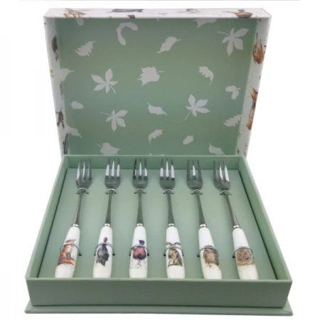 Set of six beautiful pastry forks featuring different illustrations on the ceramic handles. The forks are provided in a lovely gift box.